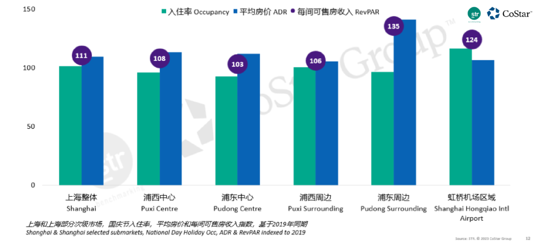 STR发布的2023年十一长假期间上海的相关数据显示,尽管上海的整体水平超过了2019年,但以浦江两岸为代表的城市核心商务区域,入住率仍未超过2019年同期水平。