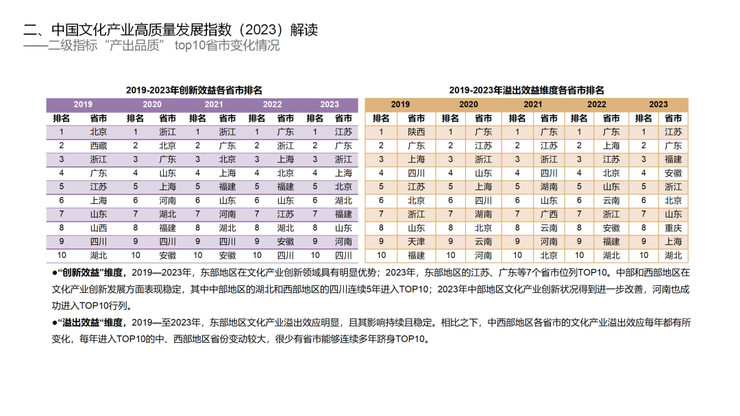“溢出效益“维度,2019-至2023年,东部地区文化产业溢出效应明显,且其影响持续且稳定。相比之下,中西部地区各省市的文化产业溢出效应每年都有所变化,每年进入TOP10的中、西部地区省份变动较大,很少有省市能够连续多年跻身TOP10。