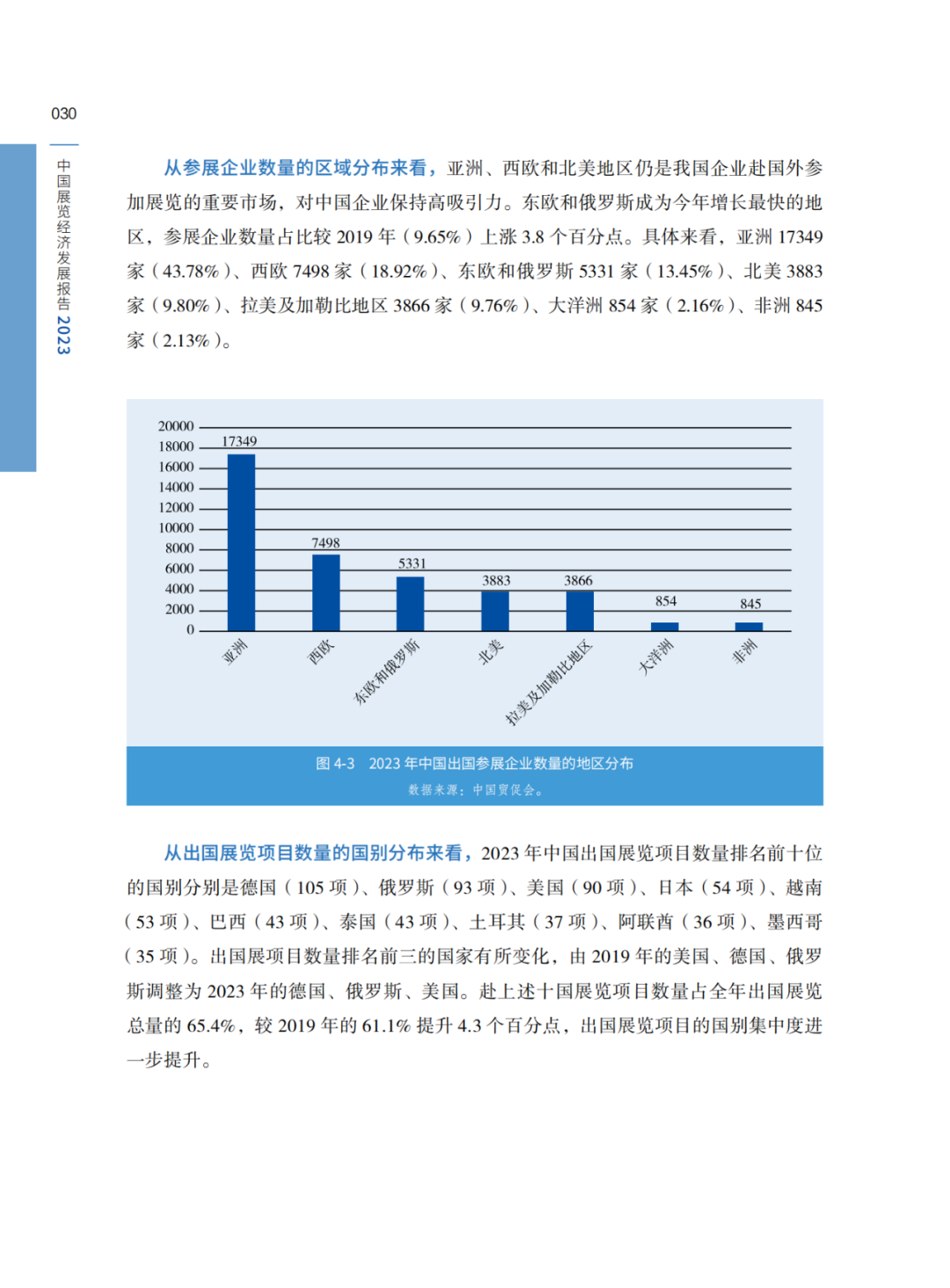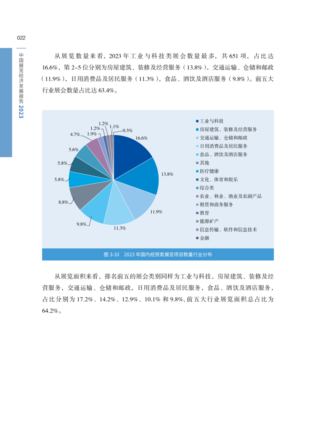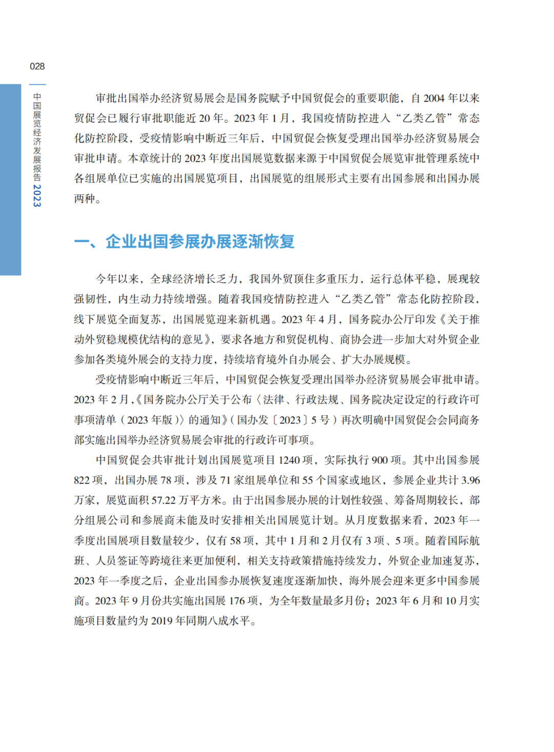 中国贸促会展览管理部部长邬胜荣介绍,2023年,中国展览业发展呈现五大特征:中国经贸类展会全面恢复至疫情前水平;展览业经营主体经营情况不断恢复向好;企业重启出国参办展,加大市场开拓力度;国家级展会成为引领展览业复苏排头兵;展览馆实际运营数量和利用率大幅提升。