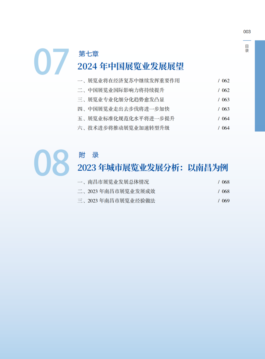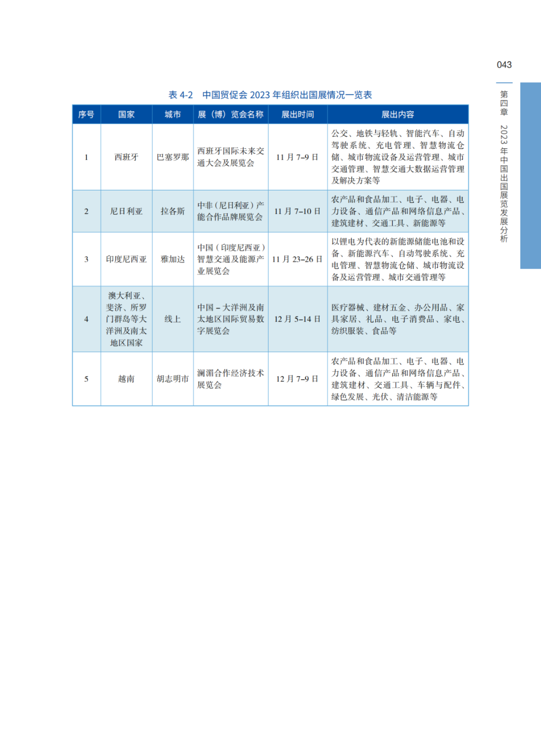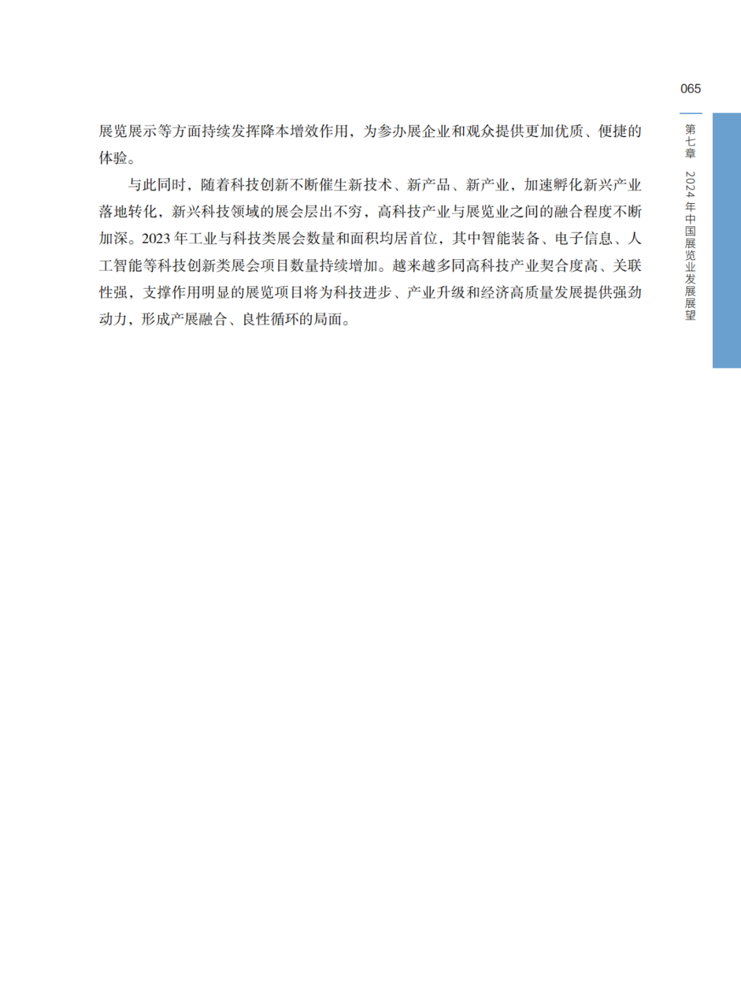 中国贸促会展览管理部部长邬胜荣介绍,2023年,中国展览业发展呈现五大特征:中国经贸类展会全面恢复至疫情前水平;展览业经营主体经营情况不断恢复向好;企业重启出国参办展,加大市场开拓力度;国家级展会成为引领展览业复苏排头兵;展览馆实际运营数量和利用率大幅提升。