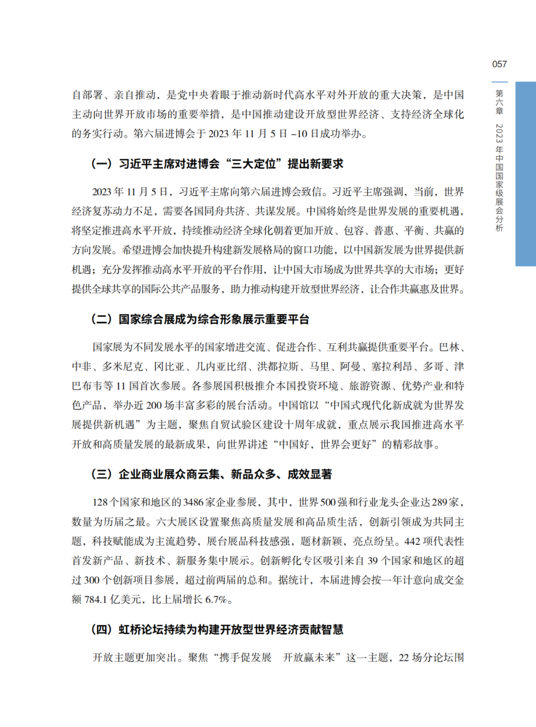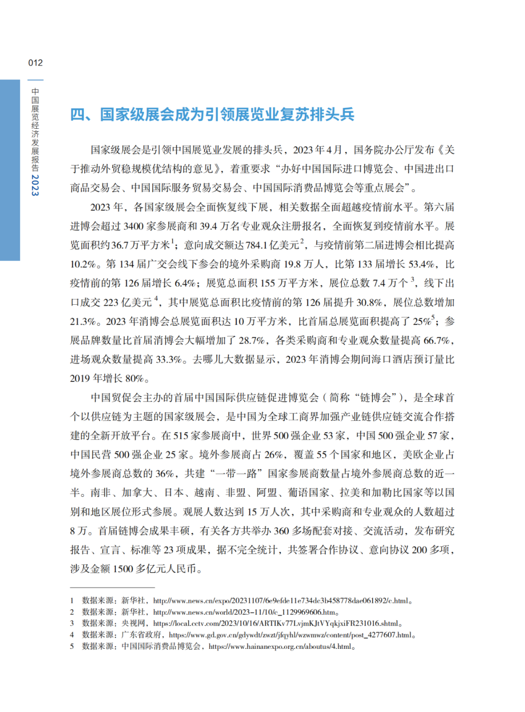 报告显示,国家级展会成为引领展览业复苏排头兵。2023年,各国家级展会全面恢复线下展,进博会、广交会、消博会等展会在规模、成效等方面全面超越疫情前水平。
