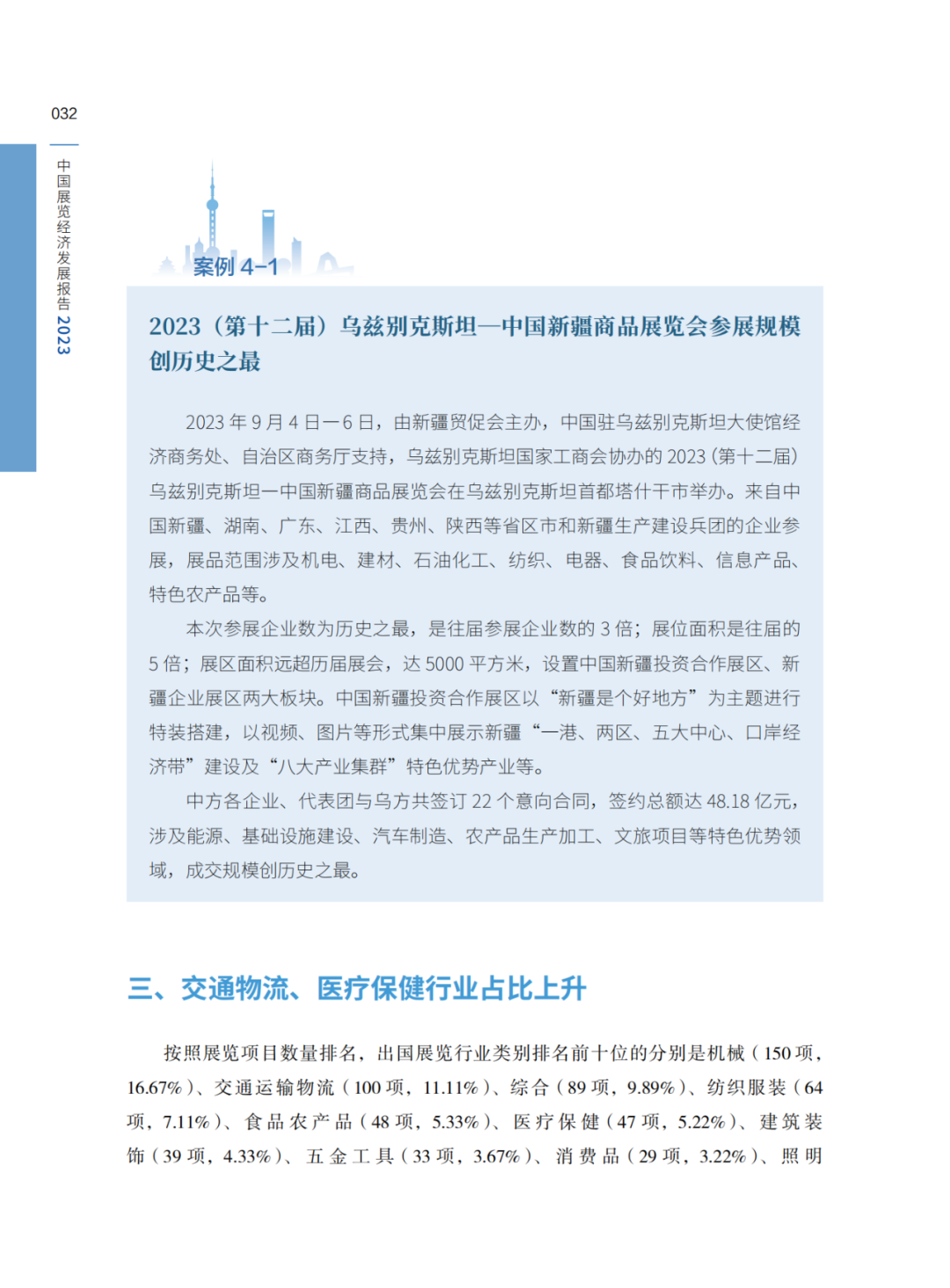 2023年中国共举办经贸类展会3923场,较2022年增长117.1%,较2019年增长10.6%;办展总面积1.41亿平方米,较2022年增长153.3%,较2019年增长8.25%。