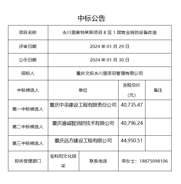 永川里奥特莱斯项目B区1层商业消防设备改造中标公告