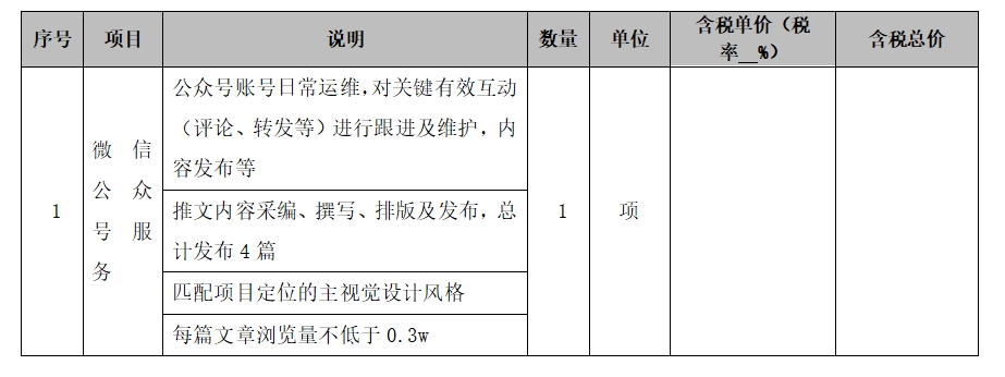备注:以上报价为固定总价包干,报价应是本次比选服务范围内全部内容,包括但不仅限于微信公众号服务技术服务费、配合费、验收相关的费用、技术文件及资料费用、以及人员成本、差旅费、管理费、利润、税金等一切可预见和不可预见费用。招标人不再另行支付任何费用。